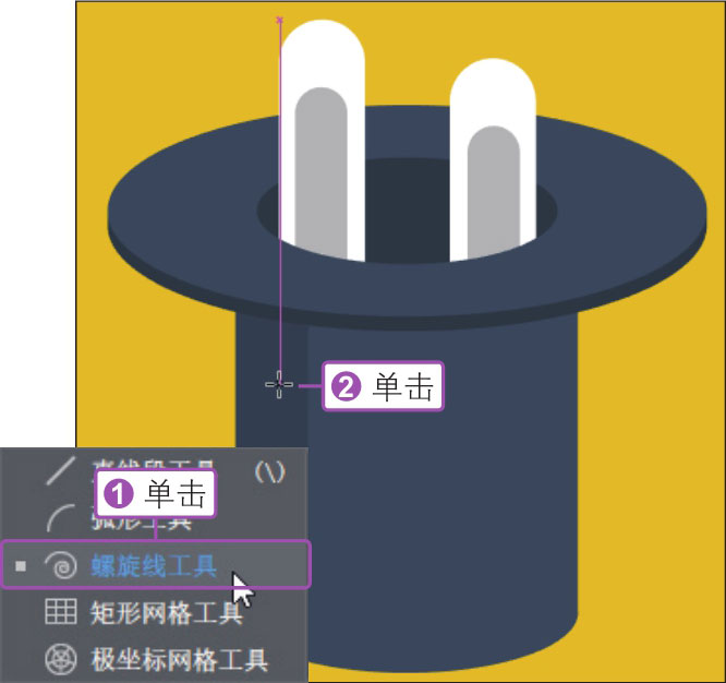 不放,①在展开的工具组中单击选择“螺旋线工具”,②在帽子上需要创建螺旋线的位置单击。