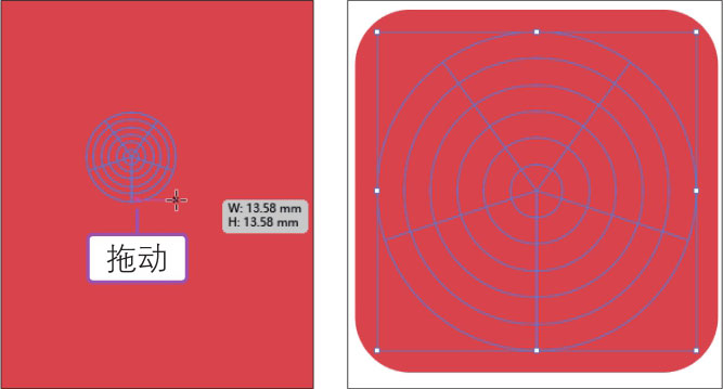 将鼠标指针定位到圆角矩形中,按住【Shift】键不放,单击并拖动鼠标,将网格图形拖动到所需大小,再用“选择工具”将其移到矩形中心。