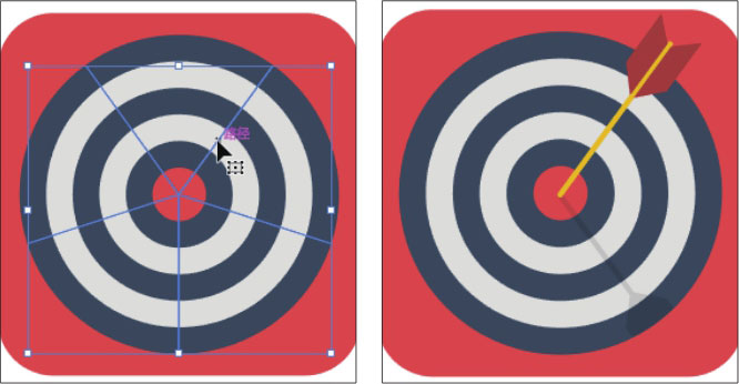 使用“选择工具”选中网格中间的分隔线,按【Delete】键将其删除,最后使用“钢笔工具”在右侧绘制箭及其投影图形,完成图标制作。