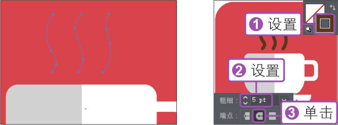 使用相同的方法绘制出另外两条曲线路径,①然后在工具箱中设置曲线描边颜色,②在“描边”面板中设置“粗细”为5pt,③单击“圆头端点”按钮