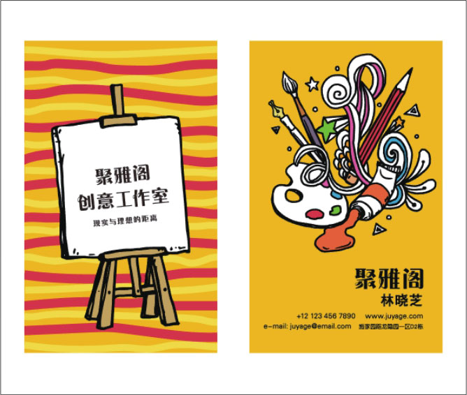 名片设计不但要讲究艺术性,还应具有很强的识别性,能让人在最短的时间内获得所需要的信息。本习题要为某艺术工作室设计名片,利用画板、颜料、绘画工具等矢量元素进行表现,使其呈现出新颖的艺术风格。