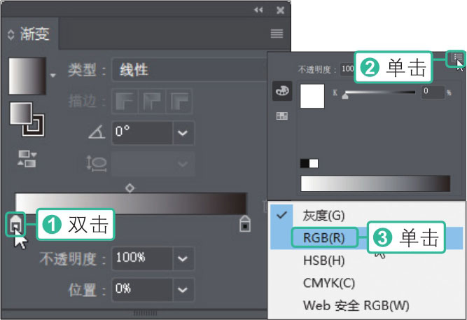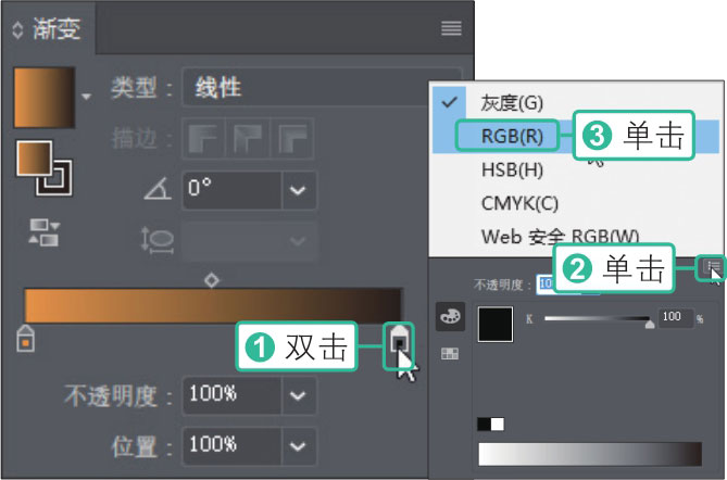 ①双击渐变条左侧的色标,②在出现的面板中单击右上角的扩展按钮