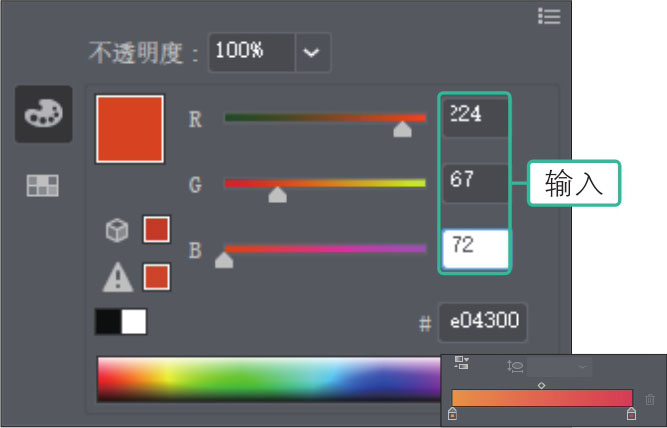 在RGB颜色模式下输入颜色值为R224、G67、B72,设置完成后返回“渐变”面板,面板中的右侧色标变为新设置的颜色。