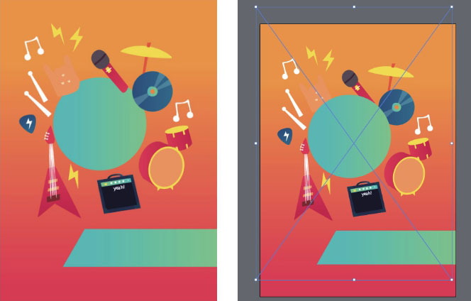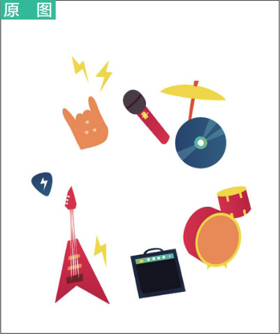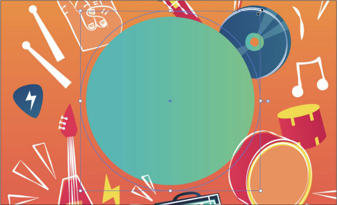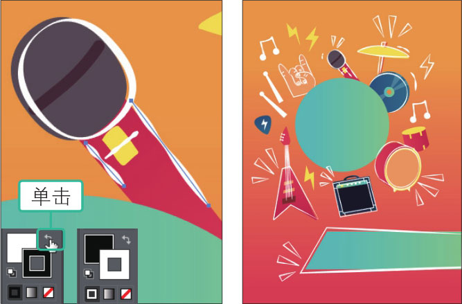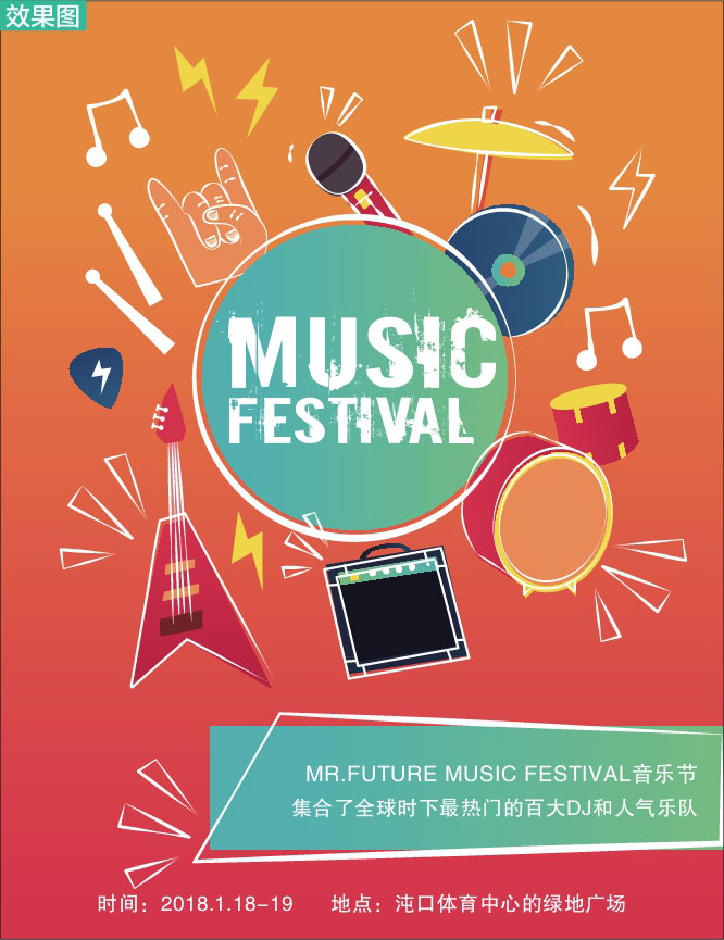 本实例要为某音乐节设计一张宣传海报。在设计过程中,采用同类色搭配的方式,为图形填充橙色到红色的渐变颜色作为海报背景,渲染出热烈的气氛;再将与音乐相关的乐器、音箱、话筒、CD等元素添加到画面视觉中心的位置,并添加上描边线条,呈现出更具动感和冲击力的视觉效果。