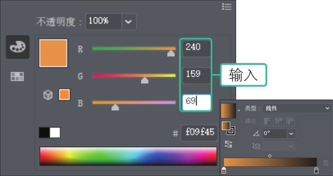 在RGB颜色模式下输入颜色值为R240、G159、B69,设置完毕后返回“渐变”面板,面板中的左侧色标变为新设置的颜色。