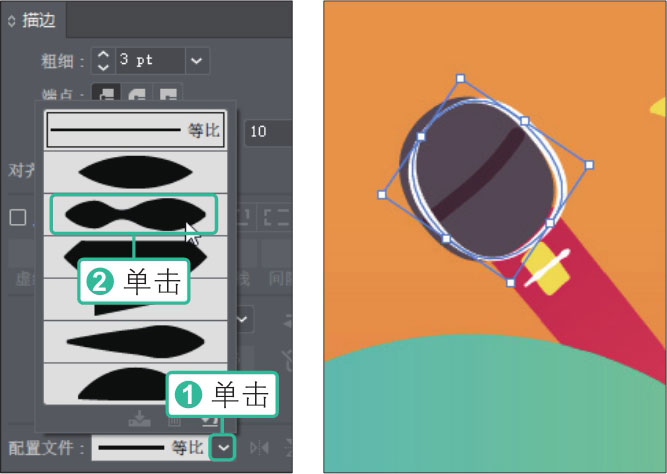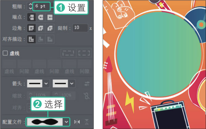 打开“描边”面板,①设置“粗细”值为6pt,②在“配置文件”下拉列表中选择“宽度配置文件2”,为复制的圆形添加描边效果。