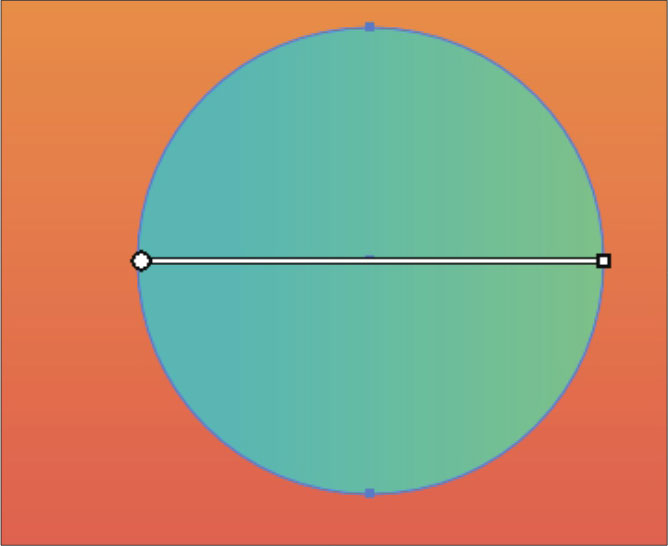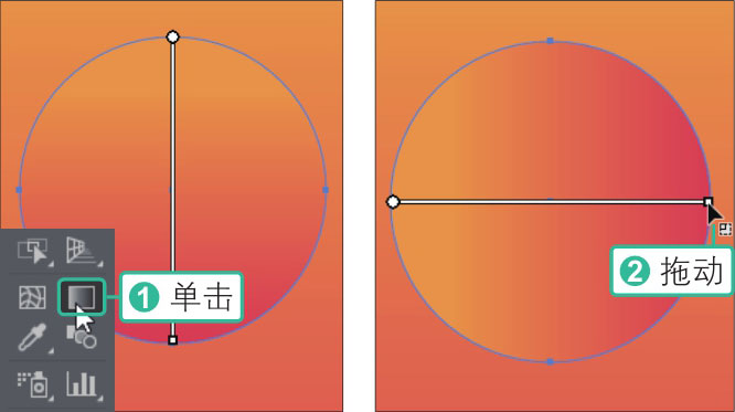 ,应用渐变的圆形图形上会显示渐变条,②在圆形左侧单击并向右拖动到圆形右侧边缘位置,释放鼠标,更改渐变填充角度。
