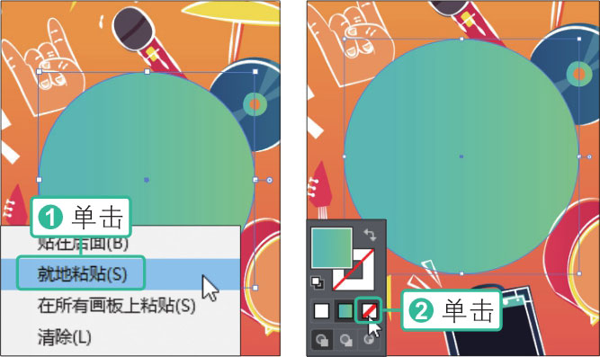 选择画板中间的圆形,按快捷键【Ctrl+C】,复制图形,①执行“编辑>就地粘贴”菜单命令,粘贴图形,②单击工具箱中的“无”按钮,去除复制的圆形的填充颜色。