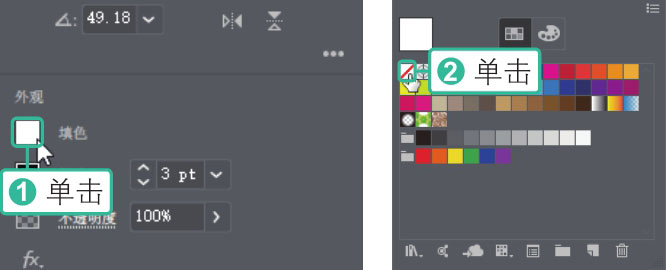 打开“外观”面板,①单击“填色”右侧的色块,激活填充选项,②单击色块旁边的下拉按钮,③在展开的面板中单击“无”色块,去除填充颜色。