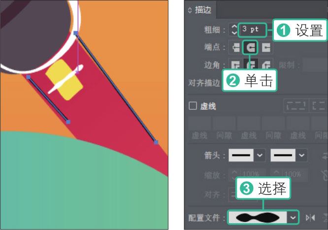 使用“钢笔工具”绘制两条直线路径,打开“描边”面板,①在面板中设置“粗细”为3pt,②单击“圆头端点”按钮,③然后选择相同的配置文件。