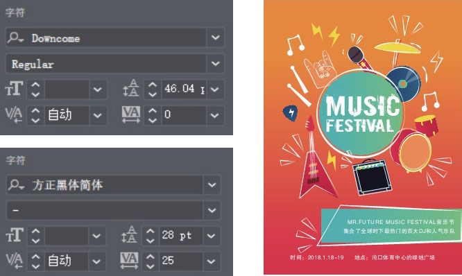 选择“文字工具”,在画板中输入合适的文字,并在“属性”面板的“字符”选项组中设置文字属性,完成海报的制作。