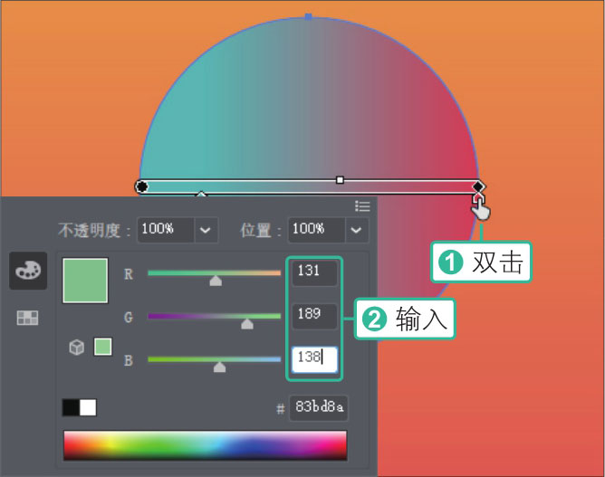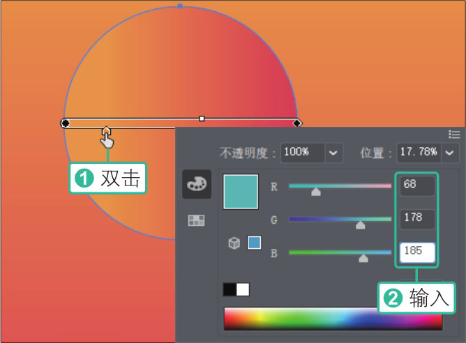 ①双击渐变起点位置的色标,②在出现的面板中输入颜色值为R68、G178、B185,重新定义渐变起点颜色。