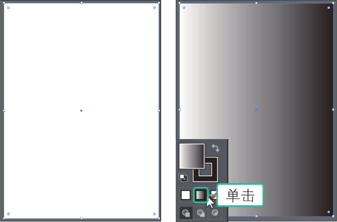 选择“矩形工具”,沿画板边缘单击并拖动,绘制同等大小的矩形,单击工具箱中的“渐变”按钮