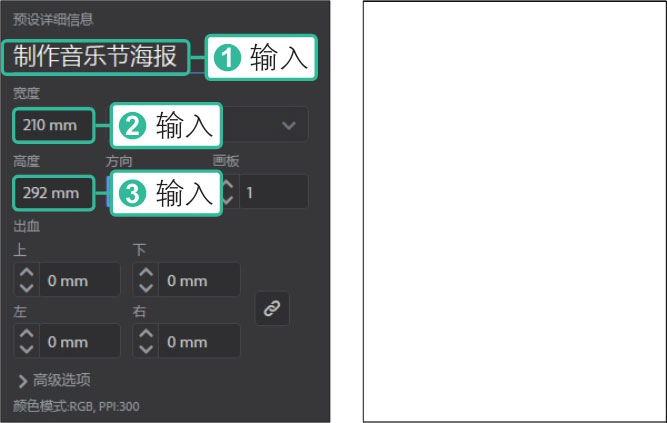 执行“文件>新建”菜单命令,①在打开的“新建文档”对话框中输入文件名为“制作音乐节海报”,②“宽度”为210mm,③“高度”为292mm,单击“创建”按钮,创建新文件。