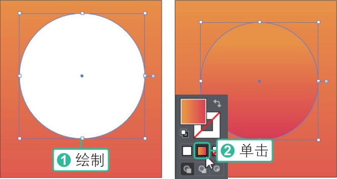 ①选择“椭圆工具”,将鼠标指针移到画板中间位置,按住【Shift】键不放,单击并拖动鼠标,绘制一个圆形图形。②单击工具箱中的“渐变”按钮