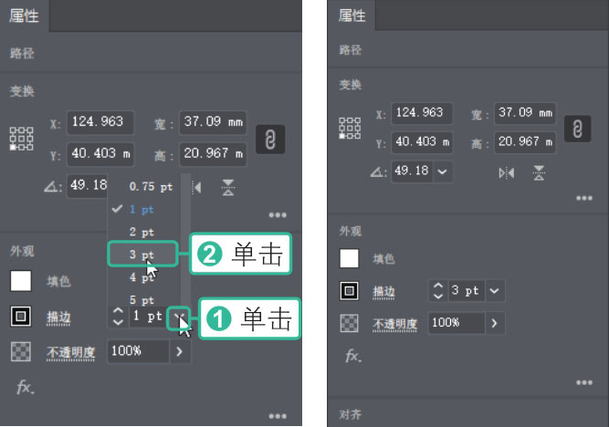 ①在“属性”面板中单击“描边”选项右侧的下拉按钮,②在展开的列表中单击选择3 pt选项,将绘制的三角形的描边粗细设置为3 pt,突出描边效果。