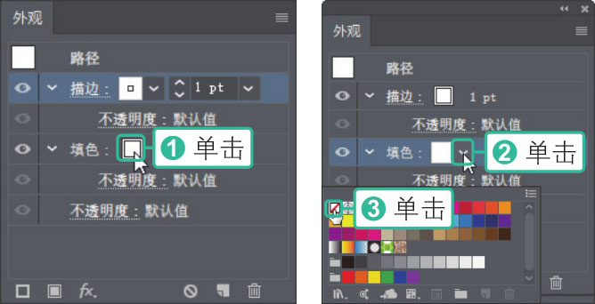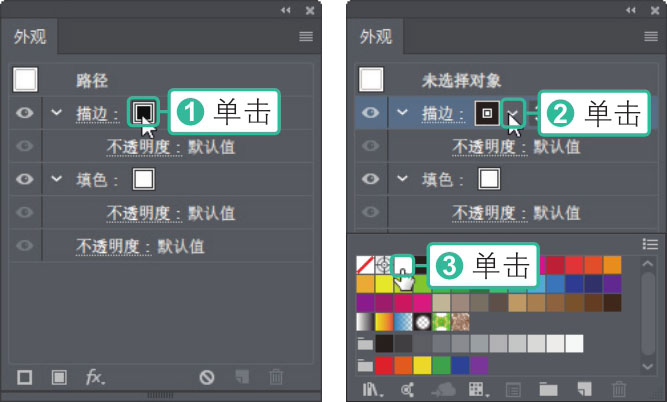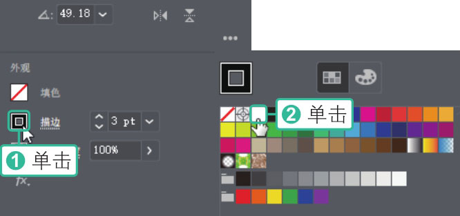 打开“外观”面板,①单击“描边”右侧的色块,激活描边选项,②单击色框旁边的下拉按钮,③在展开的面板中单击白色色块,更改描边颜色。