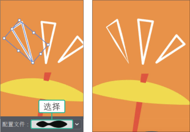 使用“选择工具”单击选中已经添加描边效果的三角形图形,打开“描边”面板,在面板中的“配置文件”下拉列表中选择相同的配置文件,更改描边效果。