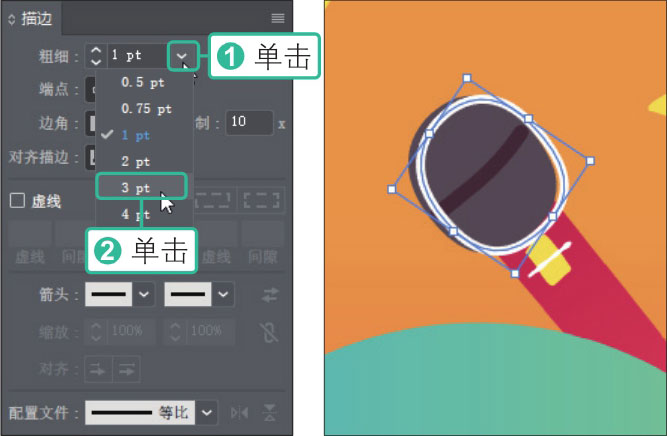 选中话筒上方的白色线框图形,执行“窗口>描边”菜单命令,打开“描边”面板,①单击“粗细”下拉按钮,②在展开的下拉列表中单击选择3pt,更改描边的粗细效果。