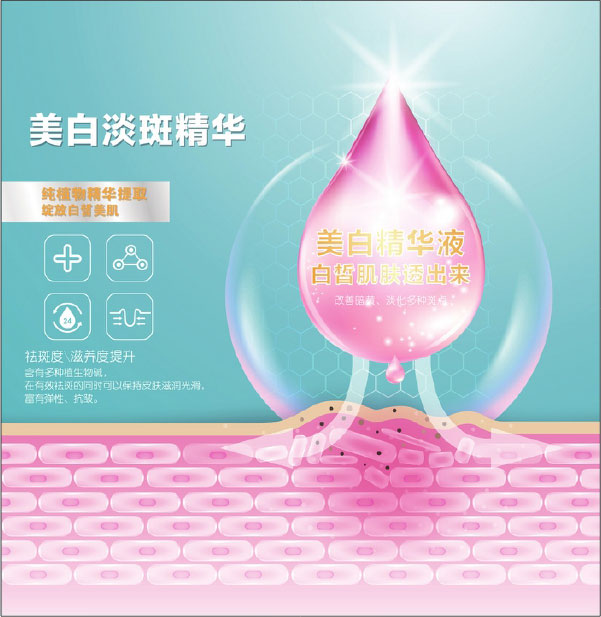 产品简介图需要将产品的功能、特点清楚地表现出来。本习题要为某品牌护肤品制作产品简介图,运用渐变网格制作出水滴形状的精华液效果,通过液体自然渗透的画面表现产品易吸收、能够快速改善皮肤的功效。