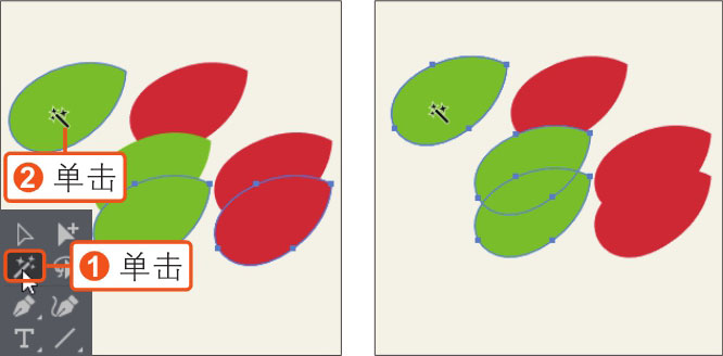 ,②将鼠标指针移到绿色图形上单击,此时可以看到画板中所有与单击对象有相同属性的绿色图形都被选中。