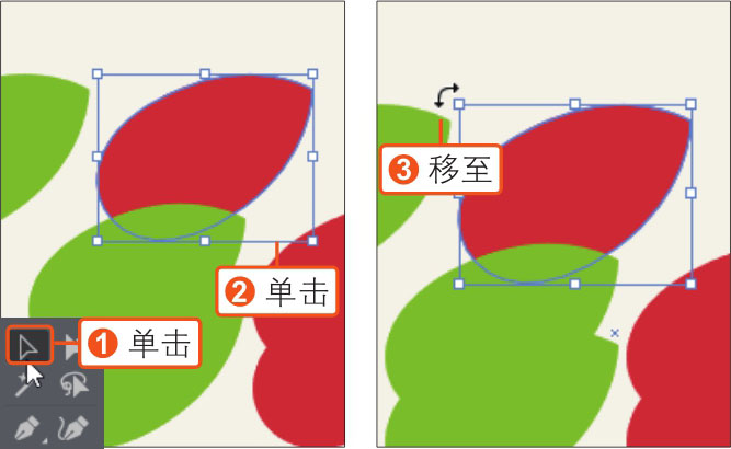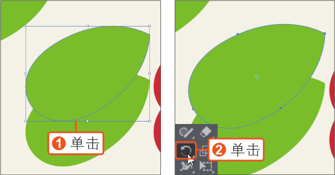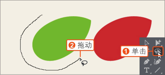 ①使用“选择工具”单击选中需要旋转的图形对象,②单击工具箱中的“旋转工具”按钮