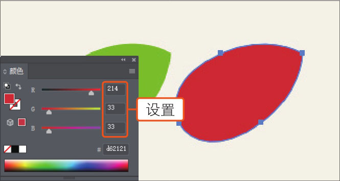 打开“颜色”面板,在面板中将填充颜色设置为R214、G33、B33,更改选中的路径对象的颜色。