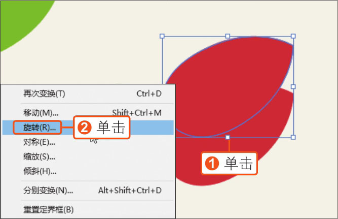 ①使用“选择工具”单击选中需要旋转的图形对象,②执行“对象>变换>旋转”菜单命令。