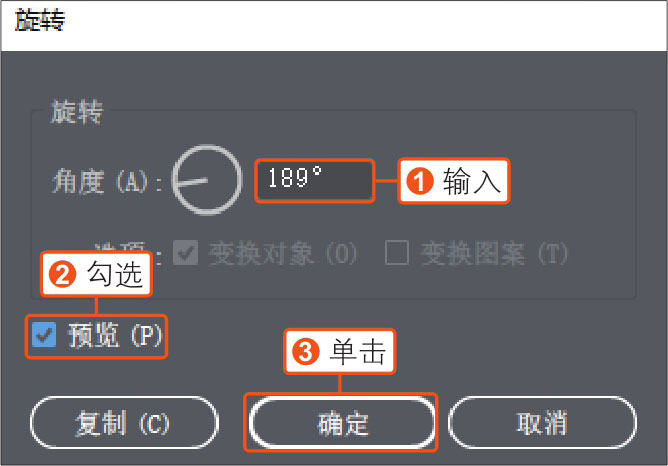 ①打开“旋转”对话框,在对话框中输入“角度”为189°,②勾选“预览”复选框,即时预览效果,③确认无误后,单击“确定”按钮。