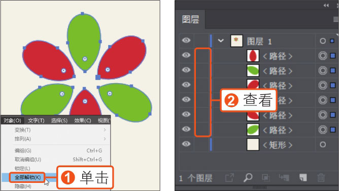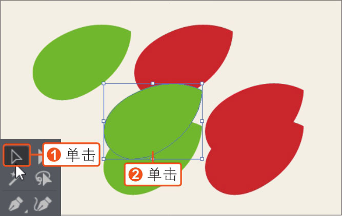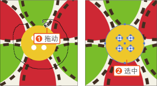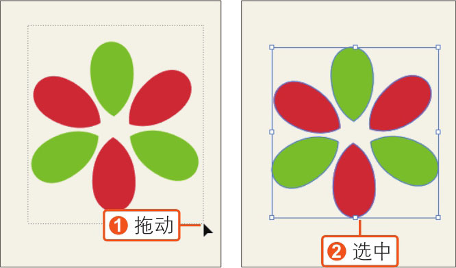 选择工具箱中的“选择工具”,①在画板中的花瓣对象附近单击并拖动鼠标,形成一个选框,框住所有花瓣对象,释放鼠标,②即可选中选框中的所有花瓣对象。