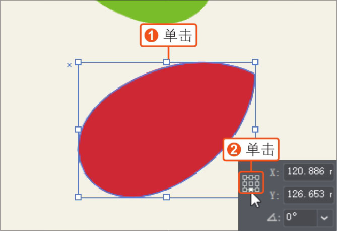 ①使用“选择工具”单击选中另一个需要旋转的图形对象,②打开“变换”面板,单击参考点定位器下方的白方块,更改旋转的中心点。