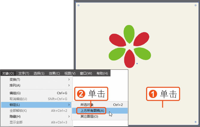 ①使用工具箱中的“选择工具”单击选中最下方的矩形对象,②执行“对象>锁定>上方所有图稿”菜单命令,锁定矩形对象上方所有的对象。