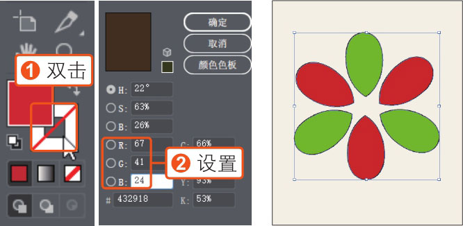 ①双击工具箱中的“描边”按钮,②在打开的“拾色器”中设置描边颜色为R67、G41、B24,更改图形的描边效果。