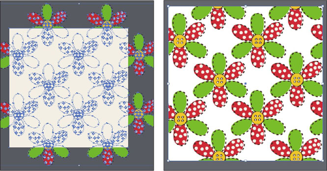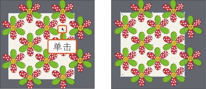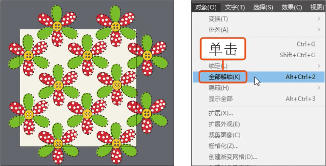 形时,单击并拖动,复制得到更多相同的花朵图形,填满整个画板。执行“对象>全部解锁”菜单命令,解锁全部对象。