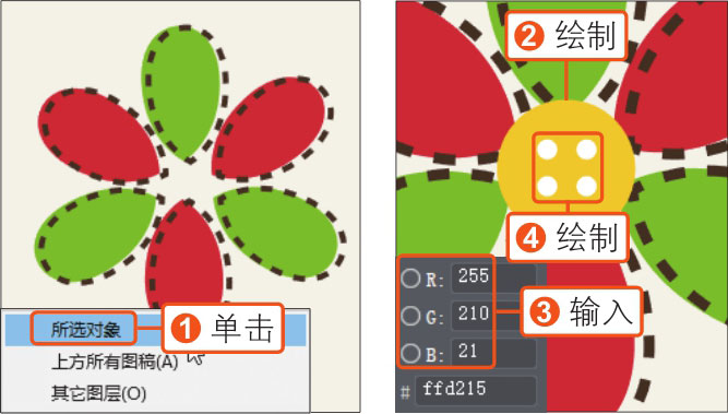 ①执行“对象>锁定>所选对象”菜单命令,锁定选中的对象,②单击选择“椭圆工具”,在花朵中心绘制圆形,③将圆形填充颜色设置为R255、G210、B21,④再在绘制好的黄色圆形中间绘制四个白色圆形。