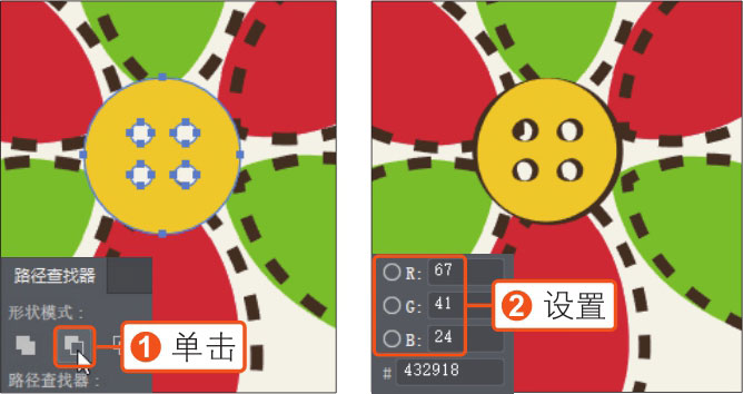 ,创建镂空的图形效果,使用“钢笔工具”在图形上方再绘制另外的图形,结合“路径查找器”面板拼合图形,打开“拾色器”对话框,②将填充颜色设置为R67、G41、B24。