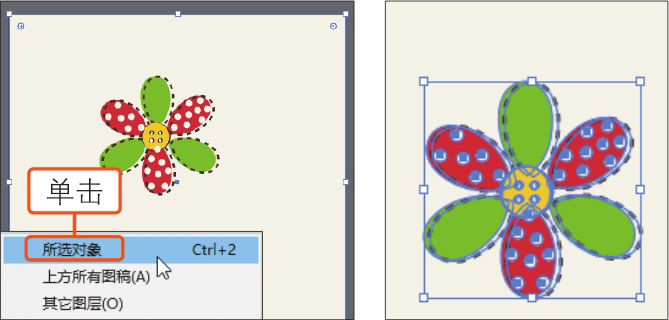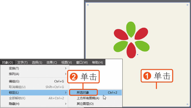 ①使用“选择工具”将描边的花朵图形向右移动到空白的位置,②框选左侧的花朵对象,③执行“对象>锁定>所选对象”菜单命令,锁定选中的多个对象。