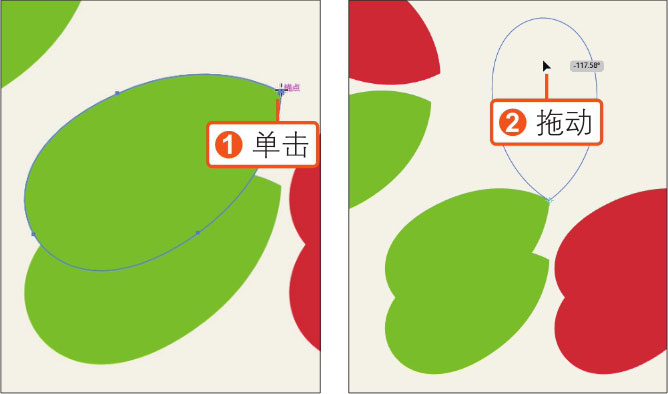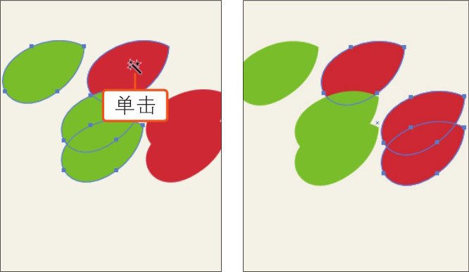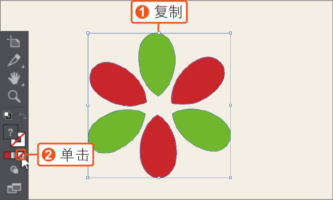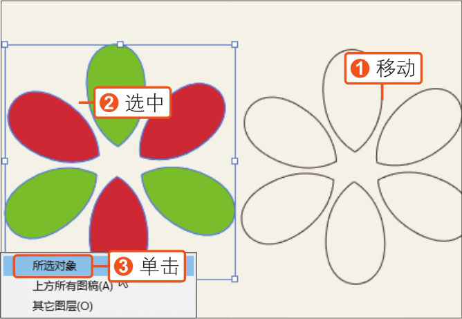 ,②将鼠标指针移到右侧复制出的花瓣图形上单击,选中整个路径。