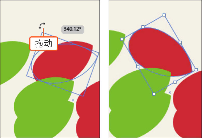在拖动过程中,图形对象会围绕自定的中心点旋转,旋转到合适的角度后释放鼠标,再用“选择工具”将旋转后的图形对象移到合适的位置。