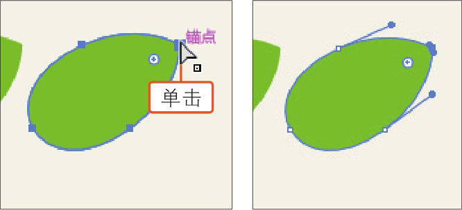 将鼠标指针移到对象右侧的一个锚点上单击,即可选中该锚点,此时会在路径中出现相应的方向线。