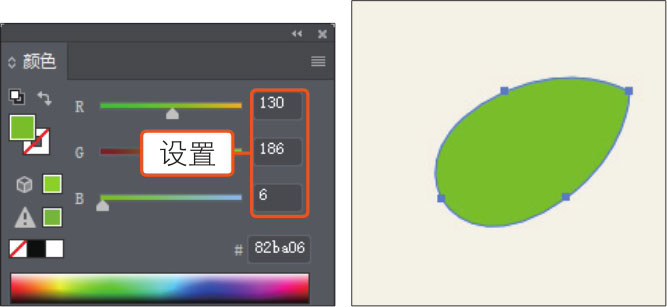 选择“钢笔工具”,在画板中绘制一个花瓣形状的图形,打开“颜色”面板,在面板中设置填充颜色为R130、G186、B6。