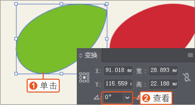 ①使用“选择工具”单击选中需要旋转的图形对象,②执行“窗口>变换”菜单命令,打开“变换”面板,在面板中可看到图形对象的当前旋转角度为0°。