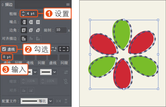 使用“选择工具”选中未锁定的对象,打开“描边”面板,①在面板中设置“粗细”为4pt,②勾选“虚线”复选框,③输入参数值为8pt,应用描边效果,将描边后的对象移到适当的位置。