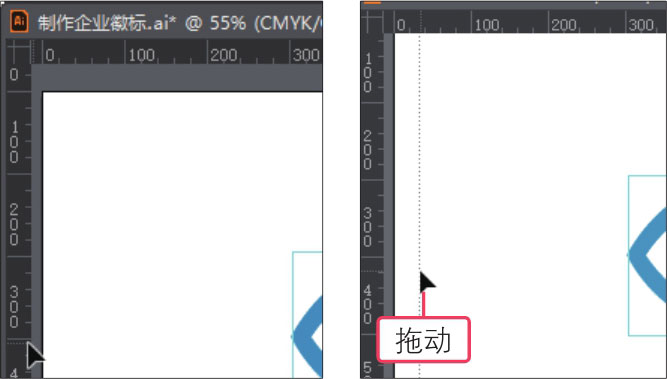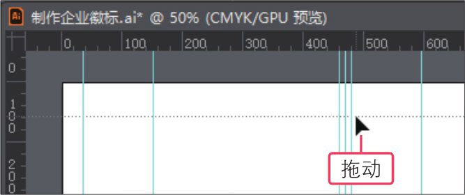 执行“视图>标尺>显示标尺”菜单命令或按快捷键【Ctrl+R】,显示标尺,将鼠标指针移到垂直标尺上,单击并向右拖动鼠标。