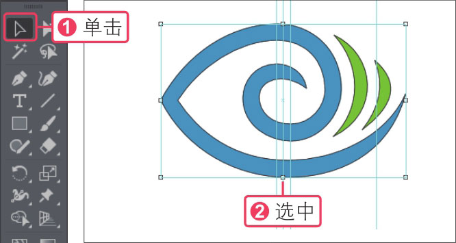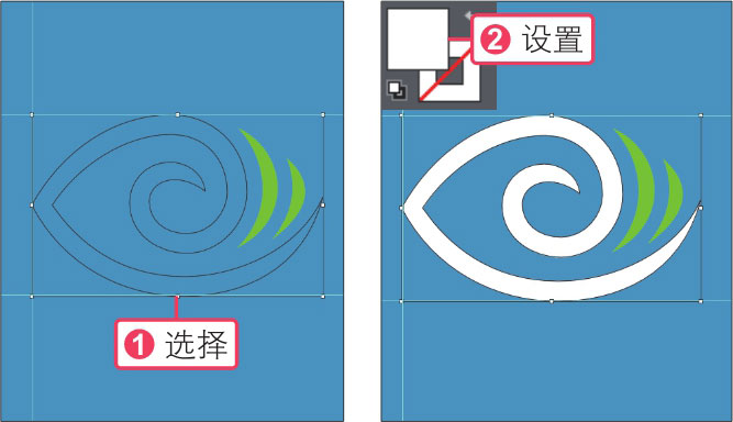 ①使用“选择工具”单击选中蓝色的图形,②在工具箱中把填充颜色更改为白色,显示出完整的徽标图形。