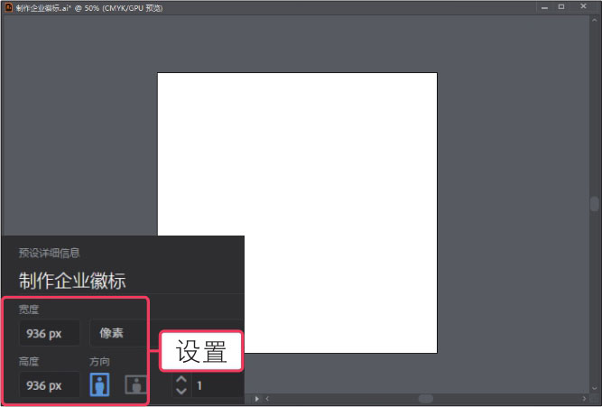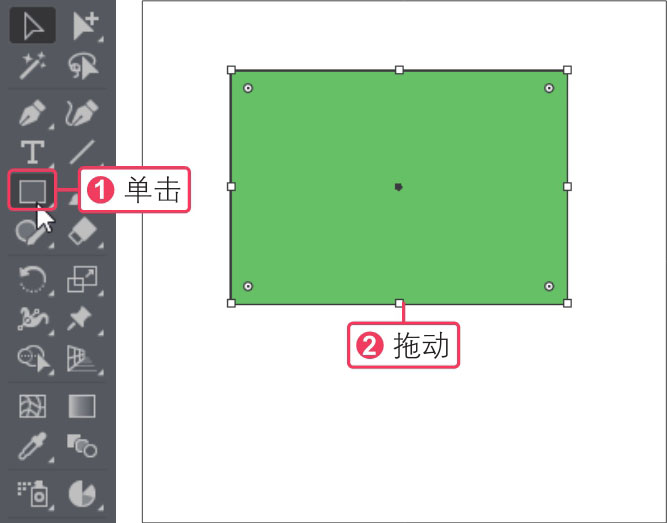 在“制作企业徽标”文件中,①单击工具箱中的“矩形工具”,②在画板中单击并拖动,绘制一个矩形图形,用于确定要绘制的徽标图形的大小和位置。