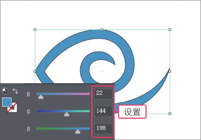 选择“钢笔工具”,在创建的参考线中间绘制出徽标图形,并在“颜色”面板中设置图形填充颜色为R22、G144、B198。