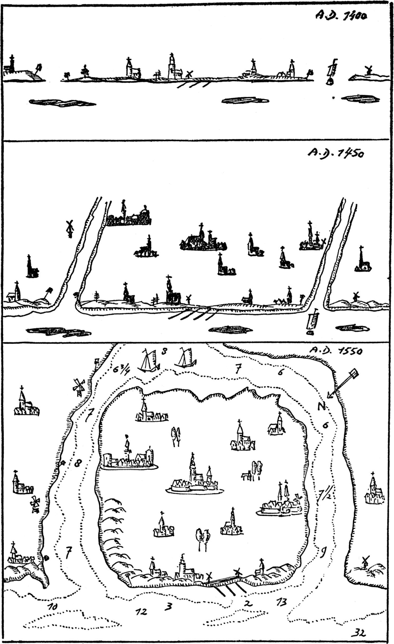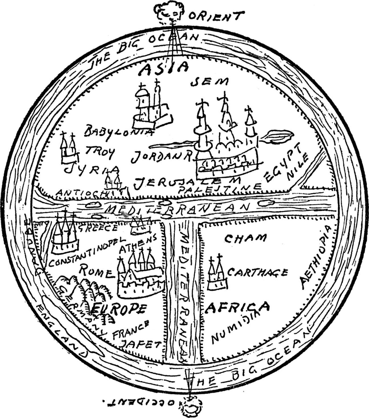 至于中世纪的地图,我们可以直接忽略。教会不赞成一切“无用的科学探索”。前往天堂的道路比莱茵河口到多瑙河口的最短路线重要得多,地图只不过是些可笑的图片,满是没头的妖怪(可怜的因纽特人是这种奇特想象的原型,他们缩在皮毛衣服里,连脑袋都看不见)、喷鼻息的独角兽、喷水的鲸鱼、长翅膀的鹰马、北海巨妖、美人鱼、鹰鹫兽等等整个恐怖迷信世界里所有的居民。自然,耶路撒冷是整个世界的中心,印度和西班牙是世界的边界,没有人会想要越过它们,苏格兰是个单独的岛屿,而巴别塔