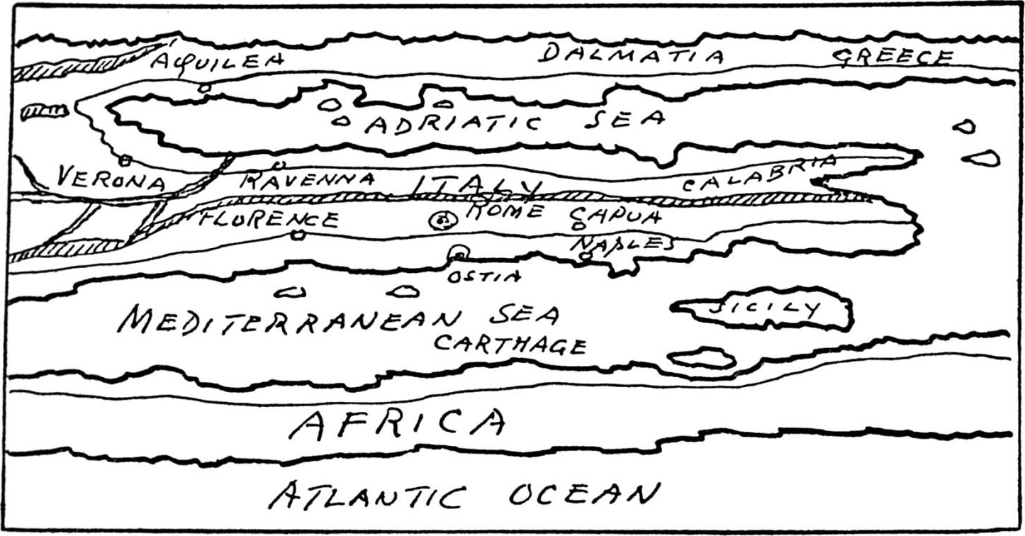 尽管如此,它的主体轮廓无疑还是出自最初的罗马版本,如果这就是罗马人最出色的作品,显然,他们还有许多东西需要学习。我会在这里临摹这张地图的一部分,你可以自己判断。只有对它进行漫长而耐心的研究之后,你才会慢慢开始理解罗马的地理学家们脑子里想的是什么。同时,也会意识到,从那个意大利细面条式的“世界”到今天,我们取得了多么大的进步。对于当年要前往英格兰或黑海的罗马将军来说,那就是行军文件里最新的成果了。
