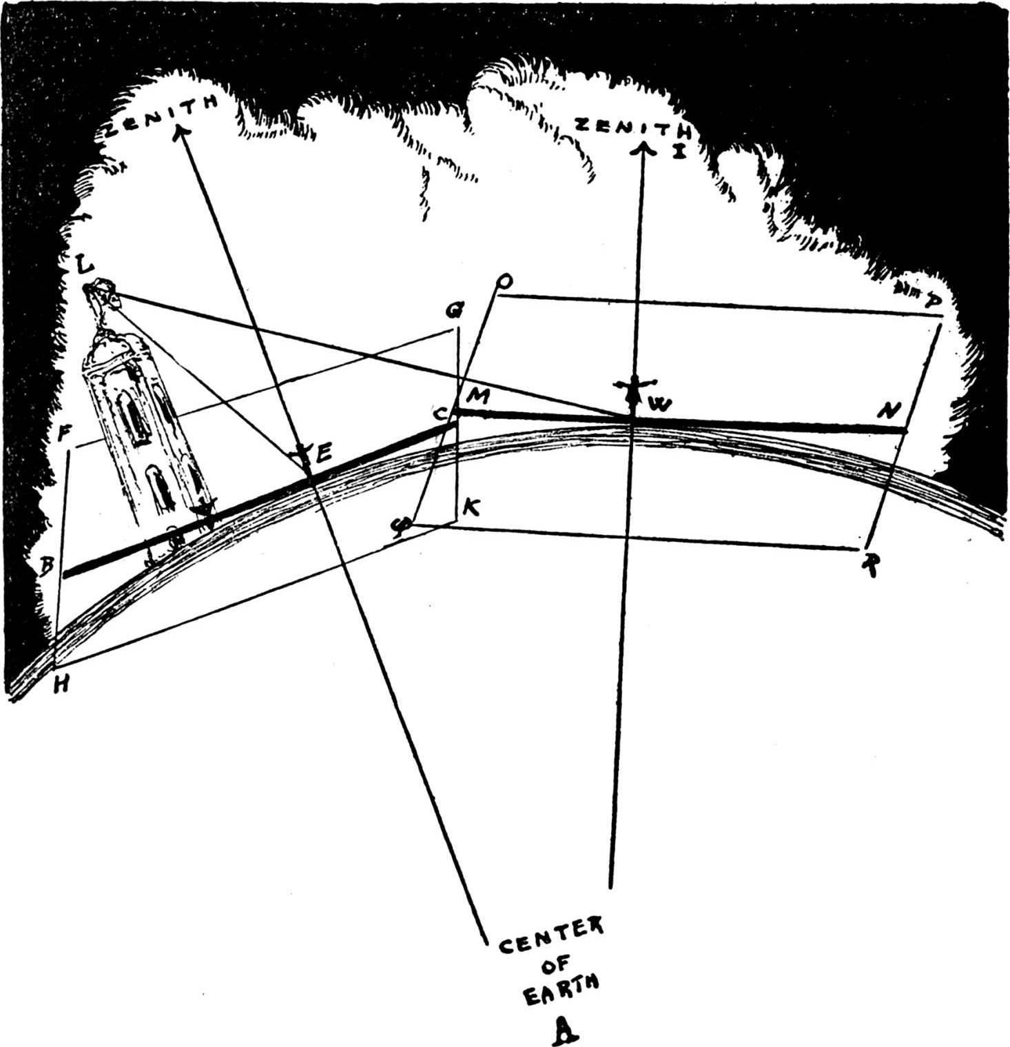 这真是太复杂了,让我们来做个实验吧,这样你能有一些直观的了解。用一根毛衣针穿透一个苹果,确保穿过了苹果正中心,然后想象你背靠毛衣针坐在苹果上。毛衣针的顶端就是天顶,而另一端则是天底。接下来,想象一个平面,刚好经过你站或坐的位置,垂直于毛衣针。当你站在E点时,这个平面就是FGKH,而BC就是经过你的观察点并沿平面伸出的线。此外,为了方便起见,也为了让这个问题稍稍简单一点,不妨想象你的眼睛长在脚趾上,不偏不倚,就是BC线与你的脚相交的点。现在,抬头去看塔顶的旗杆顶端,估算旗杆顶点(L点)、你所在的点(E点)和你脑海中那条BC线的顶端所形成的角度。BC线是假想的FGKH平面的一部分,垂直于天顶与A点之间的假想线,这条假想线连接着地心和你这名观察者头顶正上方的天顶。只要懂一点三角学,这个角度就能告诉你,你离塔有多远。移动到W点,重复这一过程。W就成了MN假想线与你相交的点,这条线属于虚构平面OPRQ,平面垂直于地球A点与新的天顶(天顶随着你的移动而改变)之间的连线。计算LWM的角度,你就知道,这里到塔的距离要远得多。